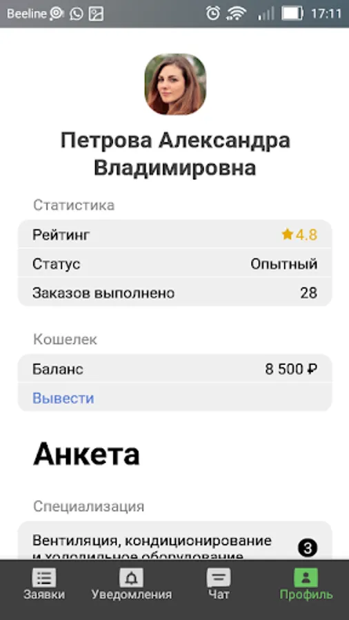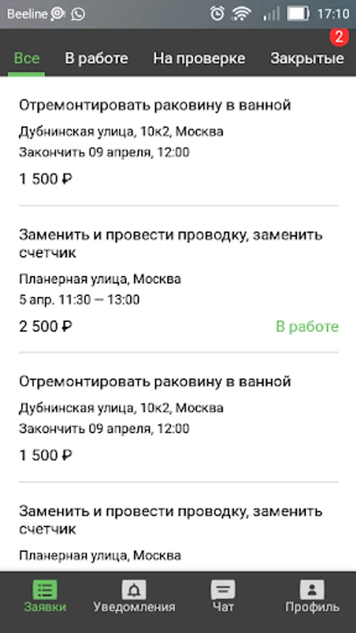 Applications are displayed according to the specializations selected in the profile, indicating the timing, address and cost of work.