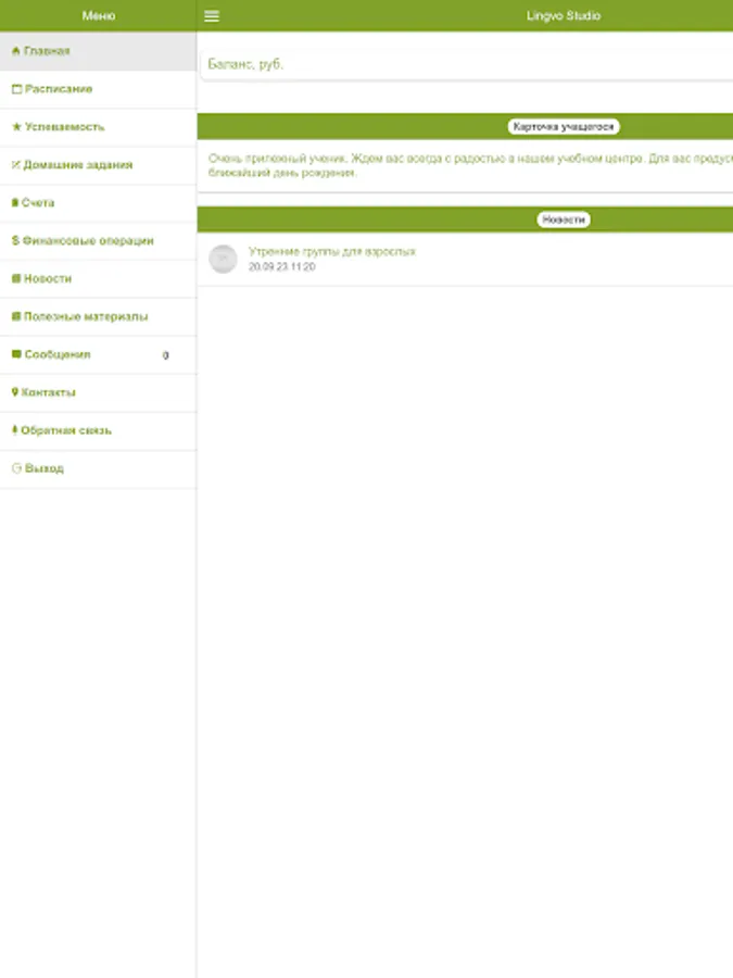 The application contains information about the schedule of your classes, test results, points earned, payments and will allow you to keep abreast of the latest news from the Lingvo Studio language center