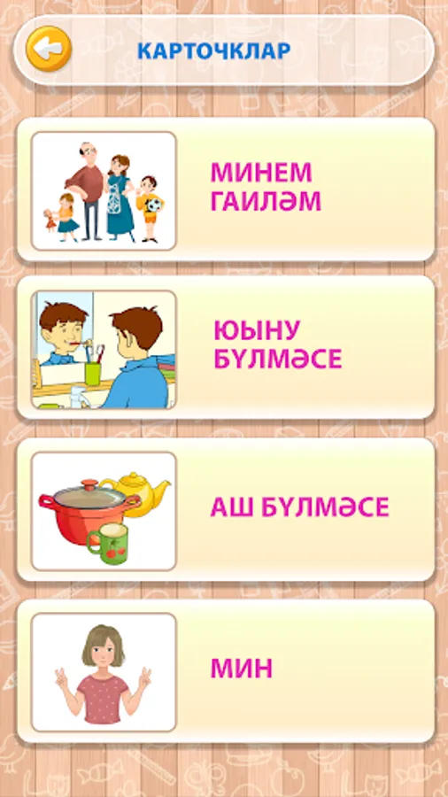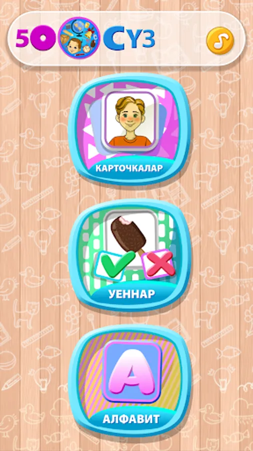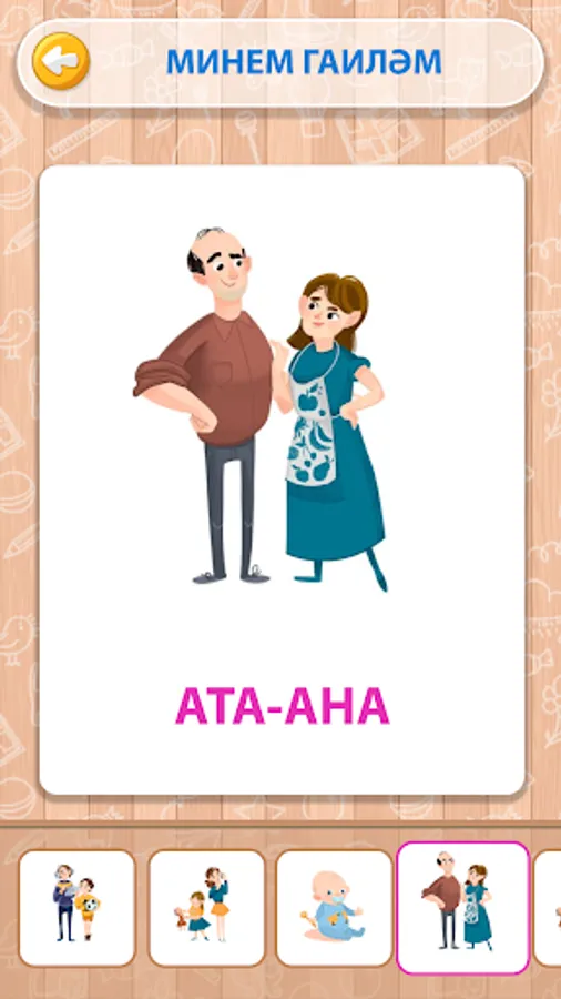 "500 Tatar words" is an application that collects the most active words of the Tatar language, which are divided into topics such as "I", "My family", "My clothes", "Animals", "Plants", etc. The application has 3 sections: alphabet, cards and games. In the "Alphabet" section you can get acquainted with the letters of the Tatar alphabet. And in the "Cards" section, you will find many words that are divided by topic. Colorful drawings, pronunciation and spelling of words will help you quickly learn and remember words. And with the help of the "Games" section, you can easily consolidate the acquired knowledge.