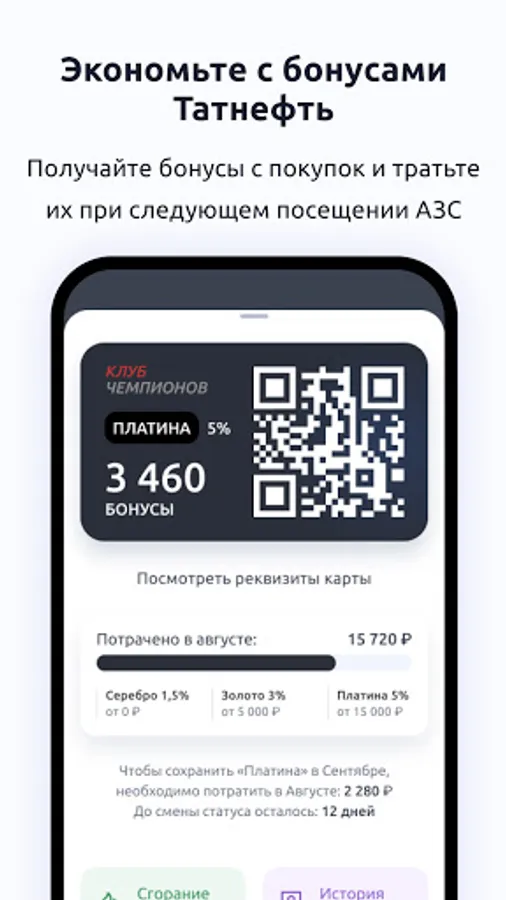 The loyalty program "Club of Champions" of the filling station network of PJSC TATNEFT was developed for motorists who want to control their expenses and receive bonuses for them, who value convenience and comfort. Join the “Champions Club” loyalty program and experience all its benefits.