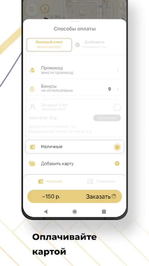 Fast and secure payment. To add a card, enter its data into the application. A QR code for payment by any banking application will be available at the end of the trip from the driver.