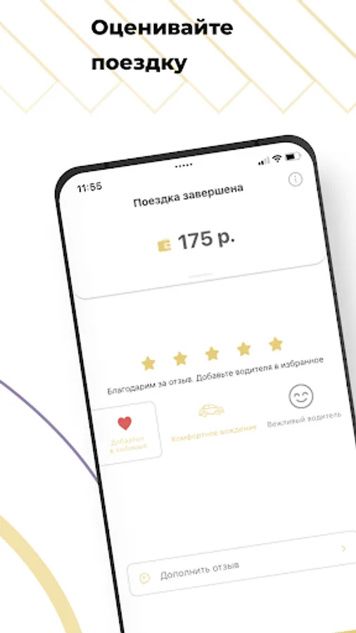 Rate your trip with ready-made templates. Add the driver to "Favorites" if you liked the trip. View payment details after the trip.