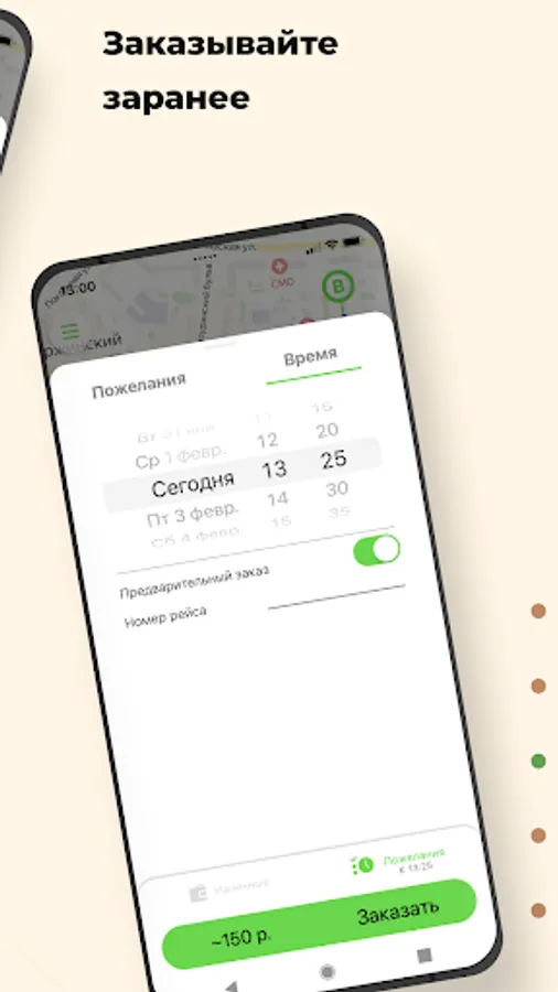 Need a car by a specific time and date? Order it in advance through the application, and at the appointed time, a taxi will be waiting for you at the entrance.