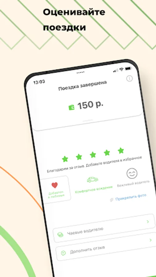 Rate the driver, write a review, or select a reaction from ready-made templates. Attach a photo to a review, leave a tip, or view payment details after your trip.