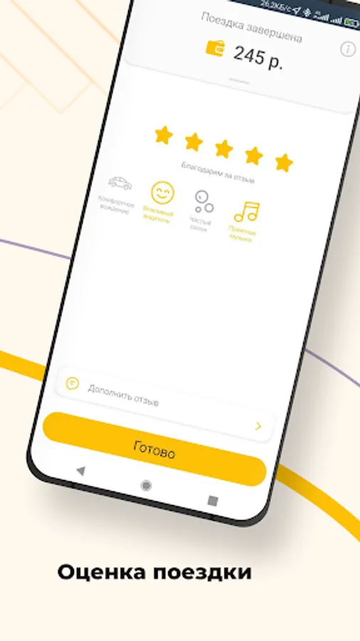 Rate the driver, write a review, or select a reaction from ready-made templates. View payment details after the trip.