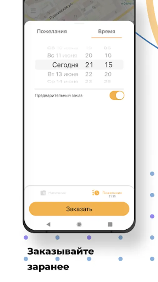 Need a car by a specific time and date? Order it in advance through the application, and at the appointed time, a taxi will be waiting for you at the entrance.