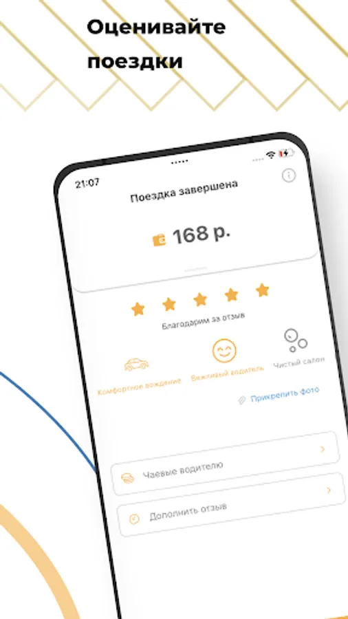 Rate your trip with ready-made templates. Add the driver to your favorites if you liked the trip, or thank him with a tip.