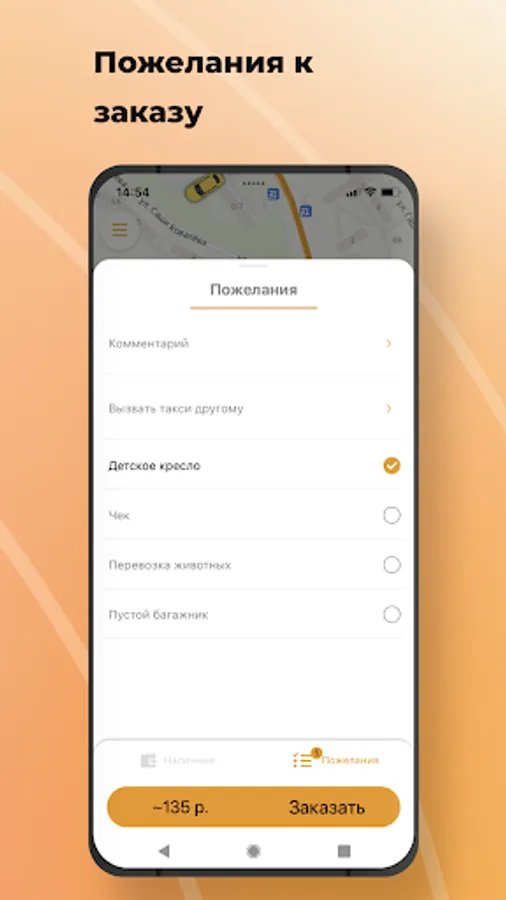 Use the option “Call a taxi for someone else” in the “Wishes” section and indicate his phone number. When the taxi arrives, an SMS will be sent to the specified number, and you will receive a message in the application.