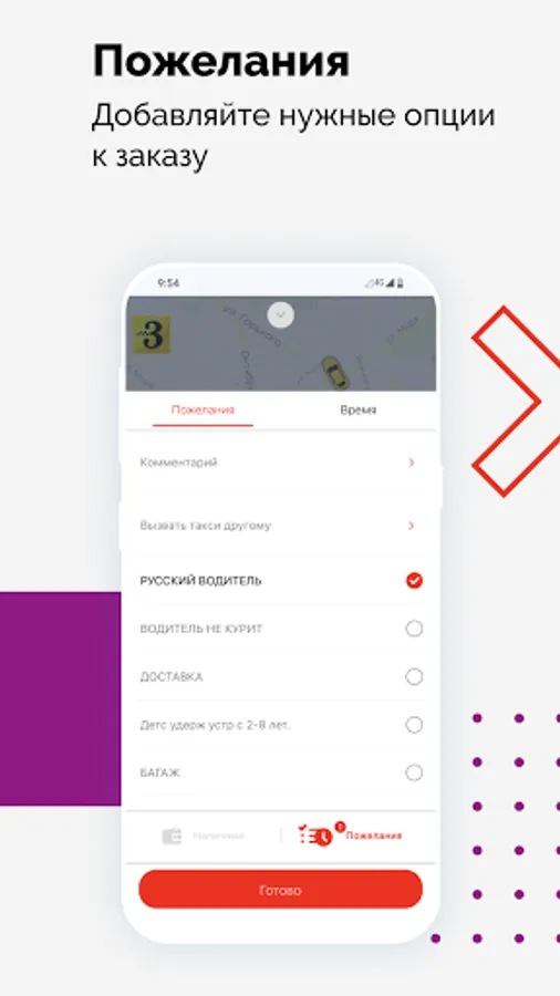 Choose from the list of special options that expand the possibilities of traveling in a Troika 35-35-35 taxi. After creating an order, they can be edited.