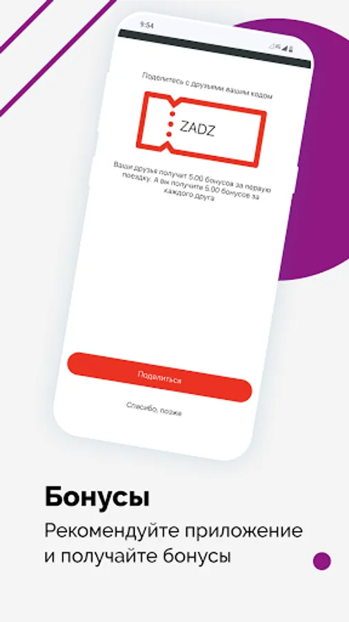 Share your referral code with your friends or via social networks and get bonuses! Use them to pay for your rides.