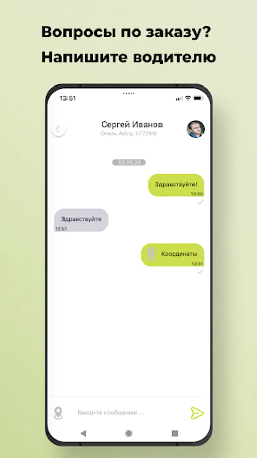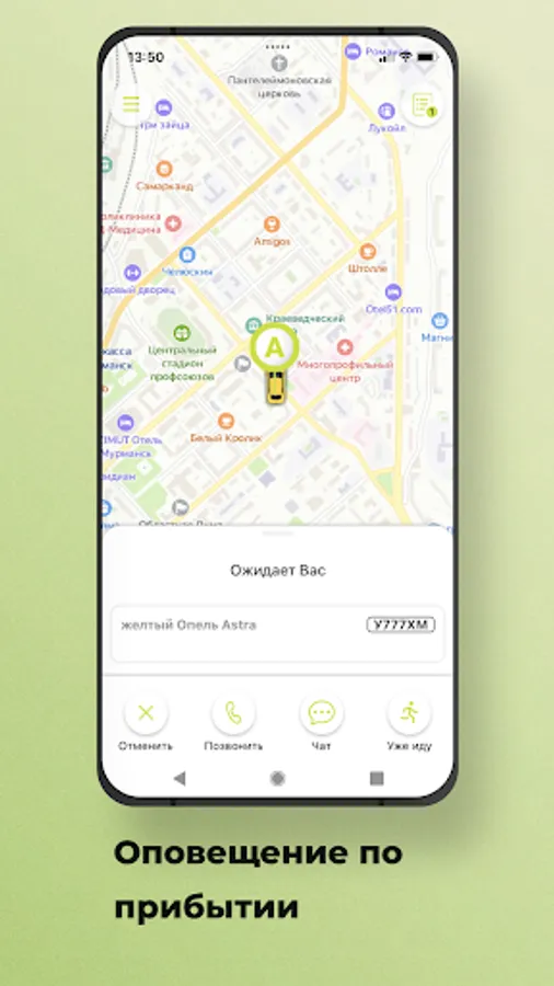 Use the option “Call a taxi for someone else” in the “Wishes” section and indicate his phone number. When the taxi arrives, an SMS will be sent to the specified number, and you will receive a message in the application.