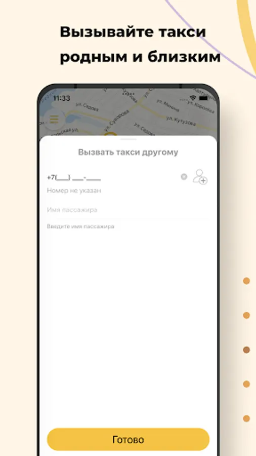 Use the option “Call a taxi for someone else” in the “Wishes” section and indicate his phone number. When the taxi arrives, an SMS will be sent to the specified number, and you will receive a message in the application.