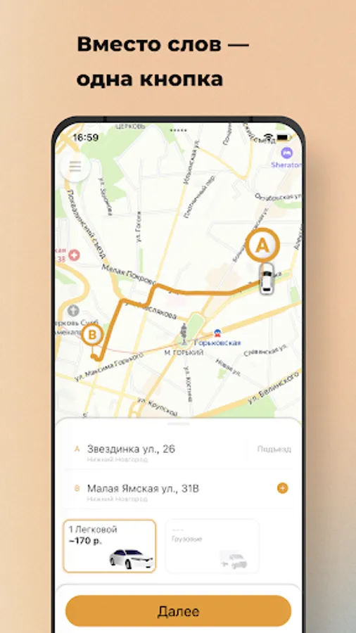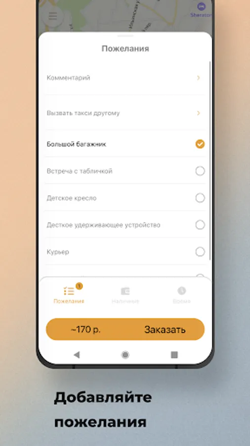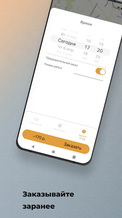 Select the "Pre-order" option. The car search will start shortly before the trip order, and the car will arrive at the appointed time. Also, you will know in advance the cost of the trip.
