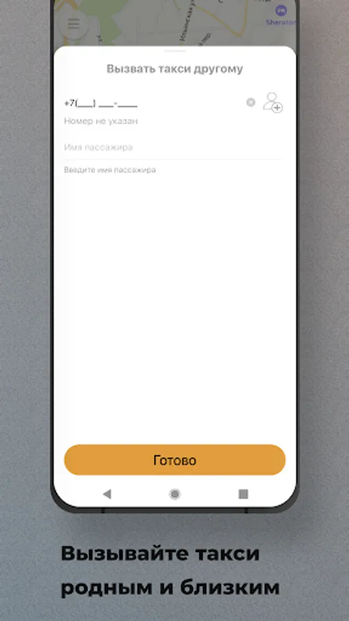 Use the option “Call a taxi for someone else” in the “Wishes” section and indicate his phone number. When the taxi arrives, an SMS will be sent to the specified number, and you will receive a message in the application.