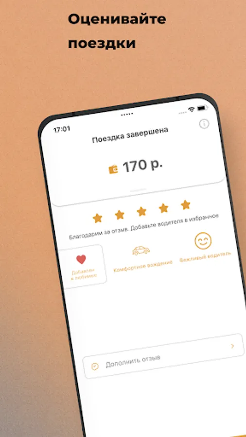 The delivery address will be determined automatically. You just need to indicate where you are going. Use templates with addresses and settings that you use most often to order a taxi in a couple of clicks.