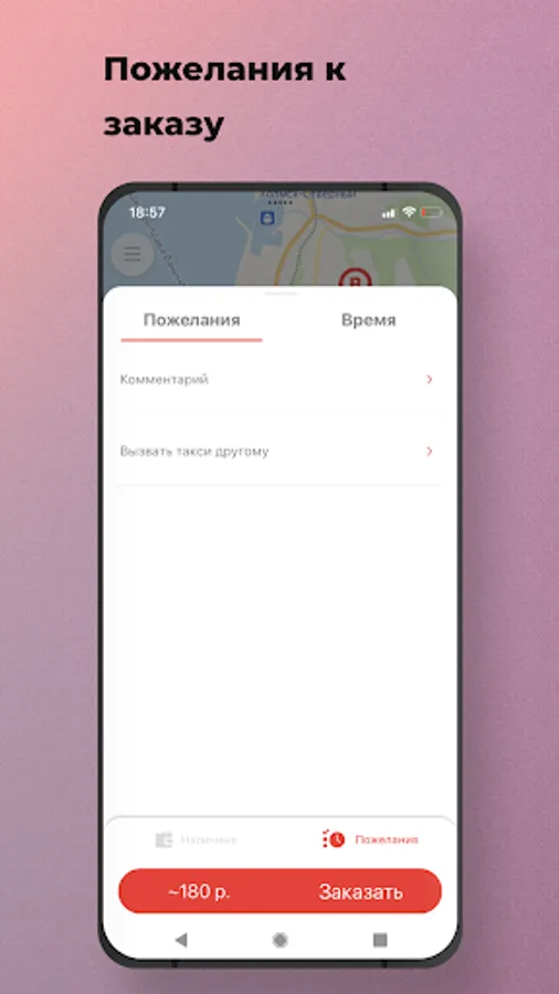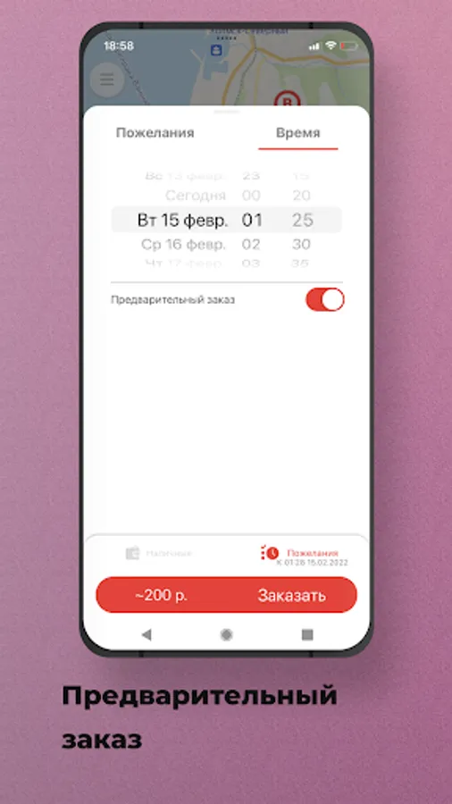Select the "Pre-order" option. The car search will start shortly before the trip order, and the car will arrive at the appointed time. Also, you will know in advance the cost of the trip.