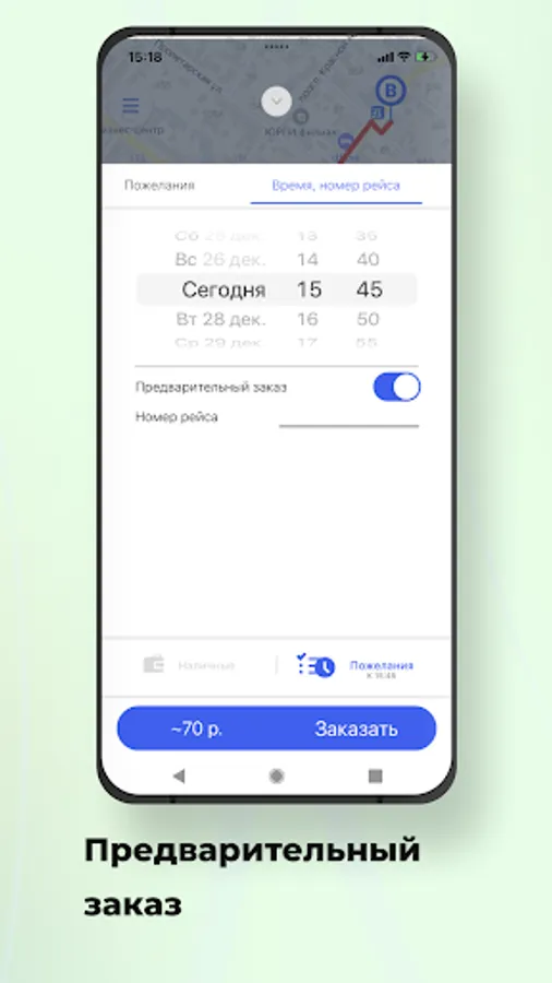 Select the "Pre-order" option. The car search will start shortly before the trip order, and the car will arrive at the appointed time. Also, you will know in advance the cost of the trip.