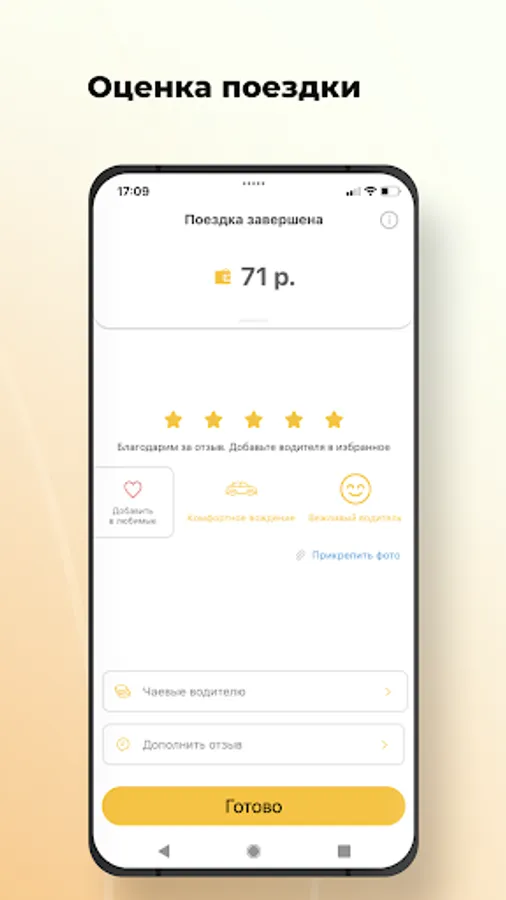 Rate the driver, write a review, or select a reaction from ready-made templates. Attach a photo to a review, leave a tip.