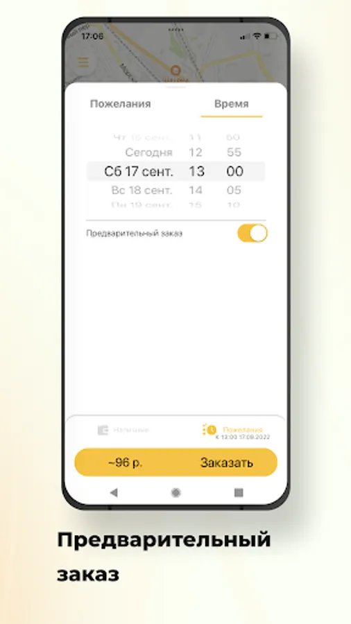 Select the "Pre-order" option. The car search will start shortly before the trip order, and the car will arrive at the appointed time. Also, you will know in advance the cost of the trip.
