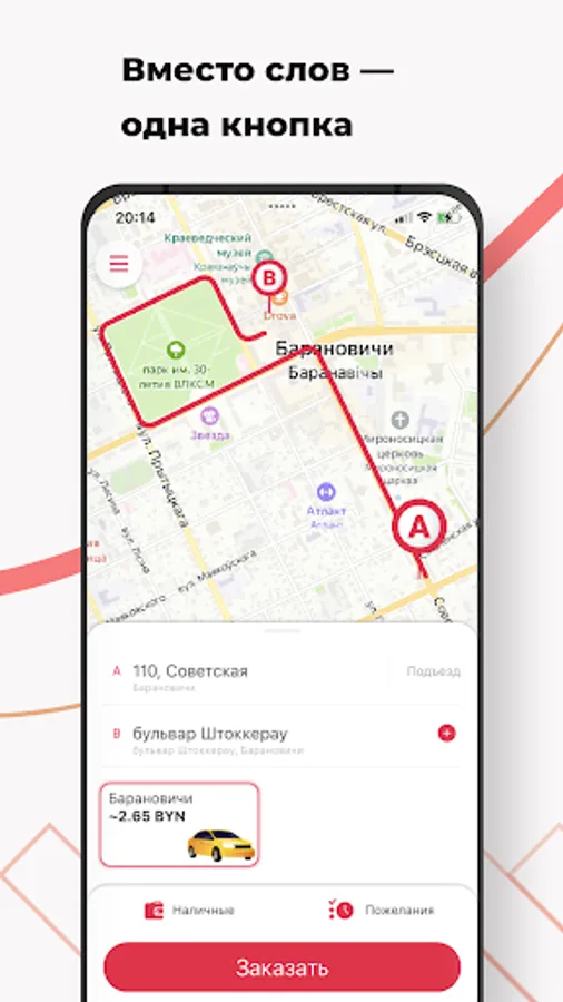 Order a taxi Kali Laska in the cities Baranovichi, Bereza, Braslav, Vileyka, Glubokoe, Zhabinka, Lida, Luninets, Nesvizh, Ostrovets, Oshmyany, Pinsk, Postavy, Pruzhany, Slonim, Slutsk, Smorgon, Stolin, Sharkovshchina through the application. It's 3 times faster than by phone! Between the desire to get to the right place and the search for a car - a couple of seconds.