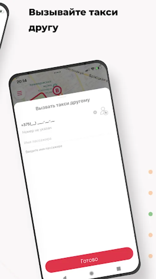 Use the option “Call a taxi for someone else” in the “Wishes” section and indicate his phone number. When the taxi arrives, an SMS will be sent to the specified number, and you will receive a message in the application.