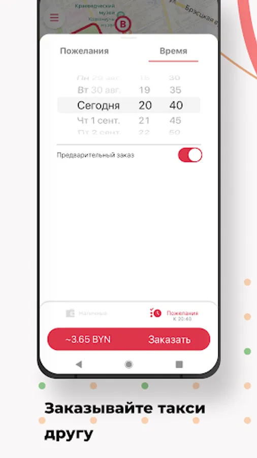 Select the "Pre-order" option. The car search will start shortly before the trip order, and the car will arrive at the appointed time. Also, you will know in advance the cost of the trip.