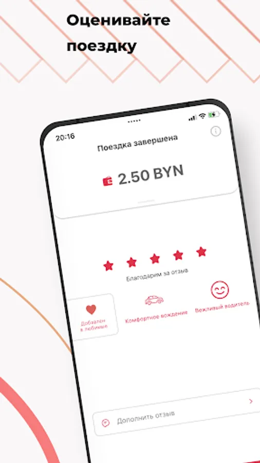 Rate the driver, write a review, or select a reaction from ready-made templates. Or see payment details after the trip.