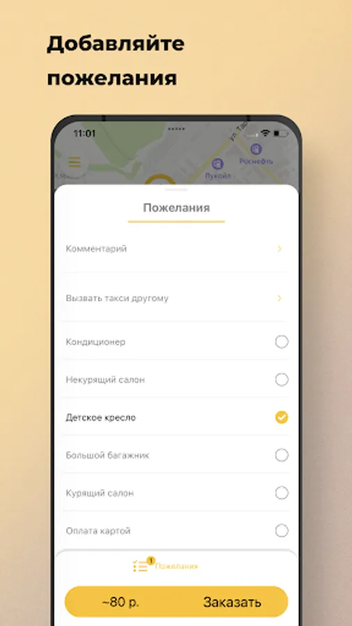 Please add additional requests to your order. For example, when it's +35 outside - select "air conditioning". If you cannot stand the smell of tobacco, select "Non-smoking salon", and a non-smoking driver will come to you.