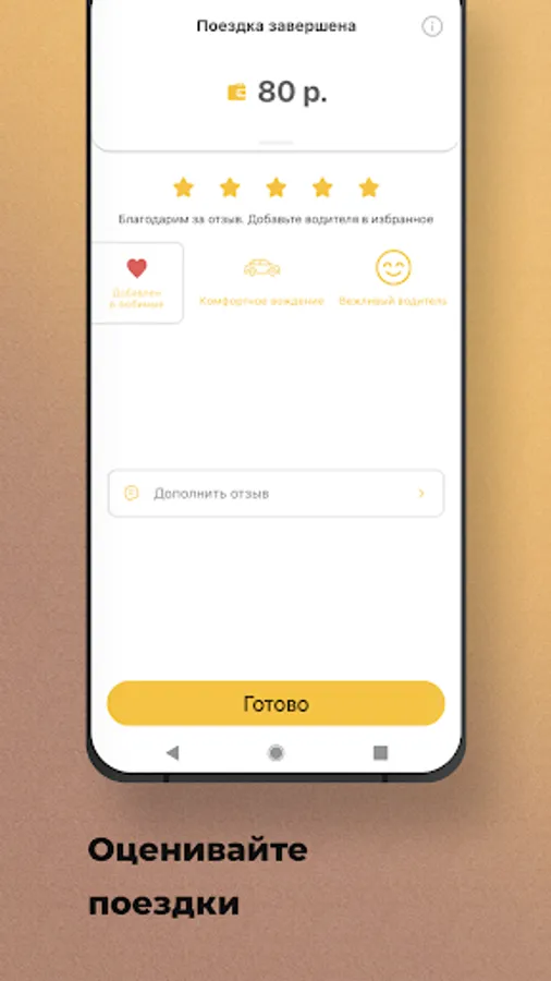 Rate the driver, write a review, or select a reaction from ready-made templates. Add the driver to your favorites if you liked the trip.
