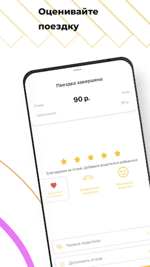 Rate your trip with ready-made templates. Add the driver to your favorites if you liked the trip, or thank him with a tip.