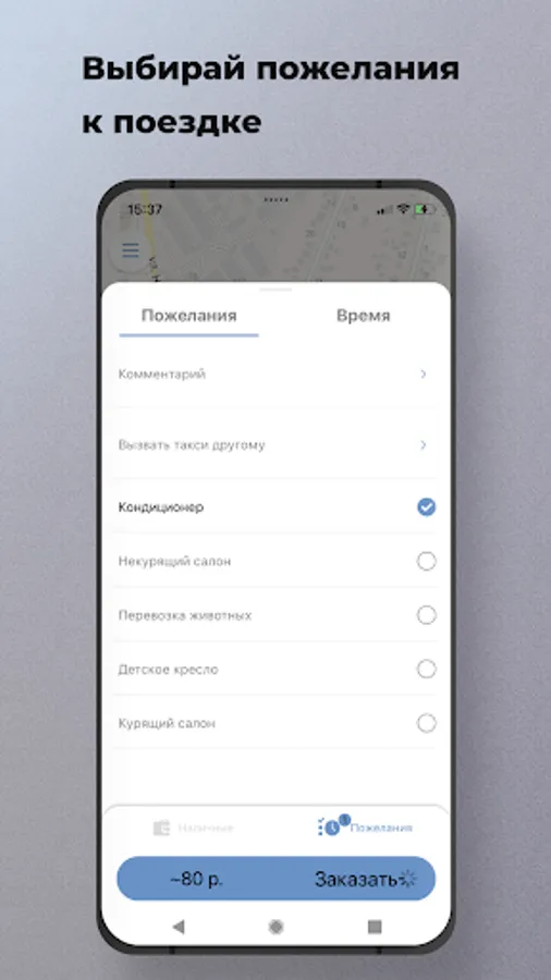 Please add additional requests to your order. For example, when it's +35 outside - select "air conditioning". If you cannot stand the smell of tobacco, select "Non-smoking salon", and a non-smoking driver will come to you.