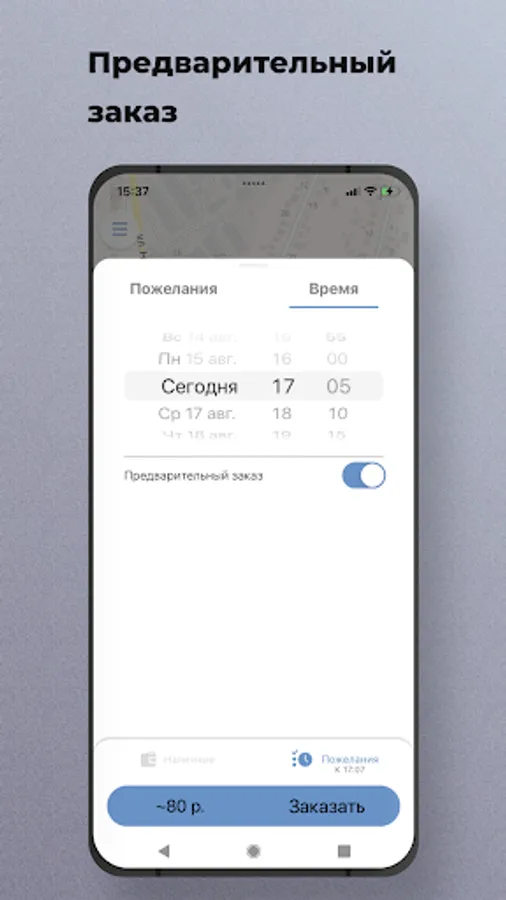 Select the "Pre-order" option. The car search will start shortly before the trip order, and the car will arrive at the appointed time. Also, you will know in advance the cost of the trip.