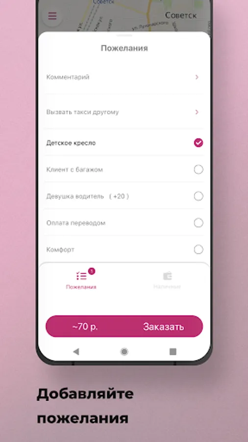 Please add additional requests to your order. For example, if you are traveling with a child, select "child seat". If you have 2 suitcases and bags in addition - indicate "Client with luggage". Or choose "Pay by bank transfer" if you don't have cash with you.
