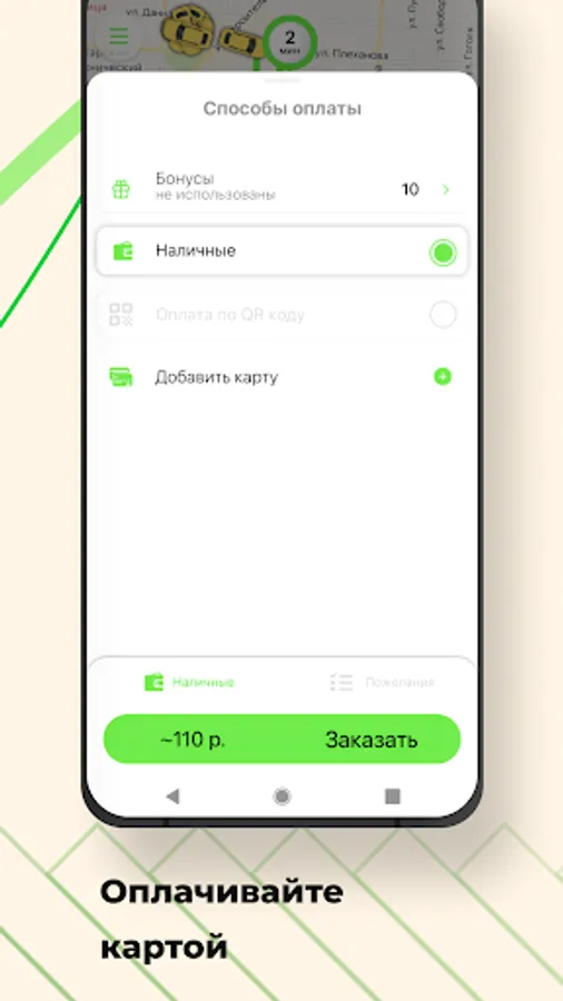Pay for trips in cash, by card or accumulated bonuses. You can also pay for the trip through any banking application using a QR code.