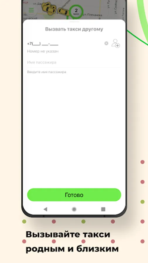 Use the option “Call a taxi for someone else” in the “Wishes” section and indicate his phone number. When the taxi arrives, an SMS will be sent to the specified number, and you will receive a message in the application.