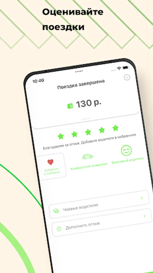 Rate the driver, write a review, or select a reaction from ready-made templates. Leave a tip or see payment details after your trip.