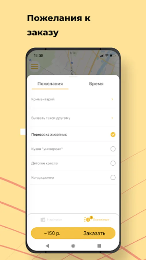 Use the option “Call a taxi for someone else” in the “Wishes” section and indicate his phone number. When the taxi arrives, an SMS will be sent to the specified number, and you will receive a message in the application.