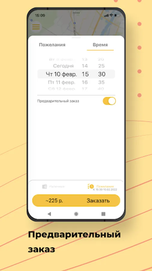 Select the "Pre-order" option. The car search will start shortly before the trip order, and the car will arrive at the appointed time. Also, you will know in advance the cost of the trip.