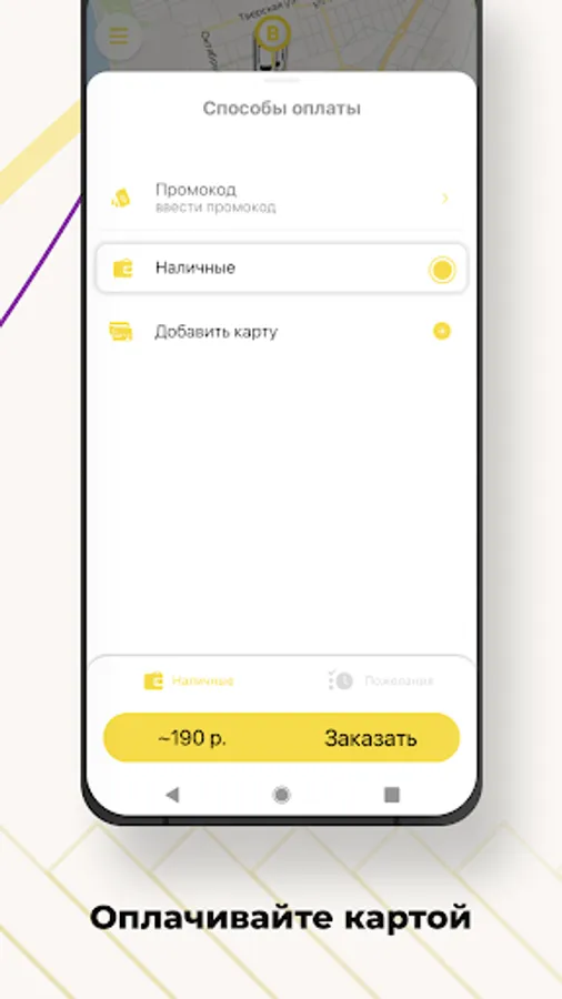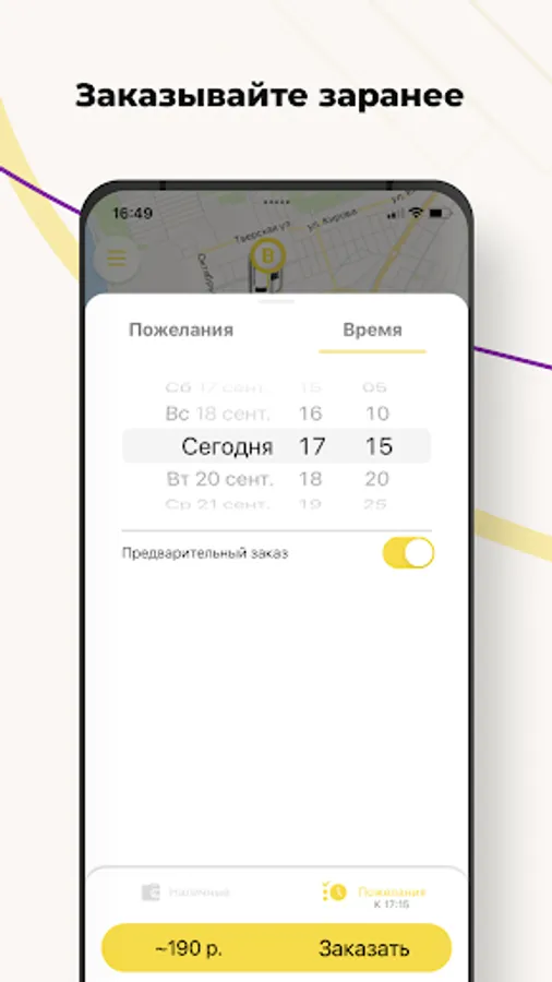 Need a car by a specific time and date? Order it in advance through the application, and at the appointed time, a taxi will be waiting for you at the entrance.