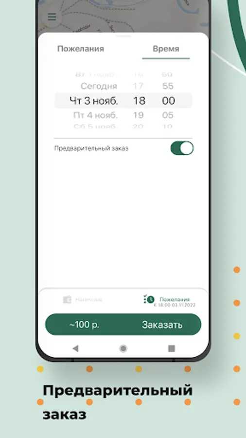 Select the "Pre-order" option. The car search will start shortly before the trip order, and the car will arrive at the appointed time. Also, you will know in advance the cost of the trip.