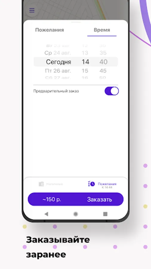 Need a car by a specific time and date? Order it in advance through the application, and at the appointed time, a taxi will be waiting for you at the entrance.