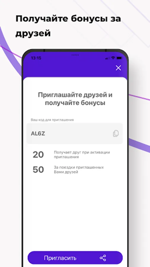 Invite friends with a referral code and get bonuses for their trips. And also, for the trips of their friends. Use bonuses to pay for taxi Cruise-56.