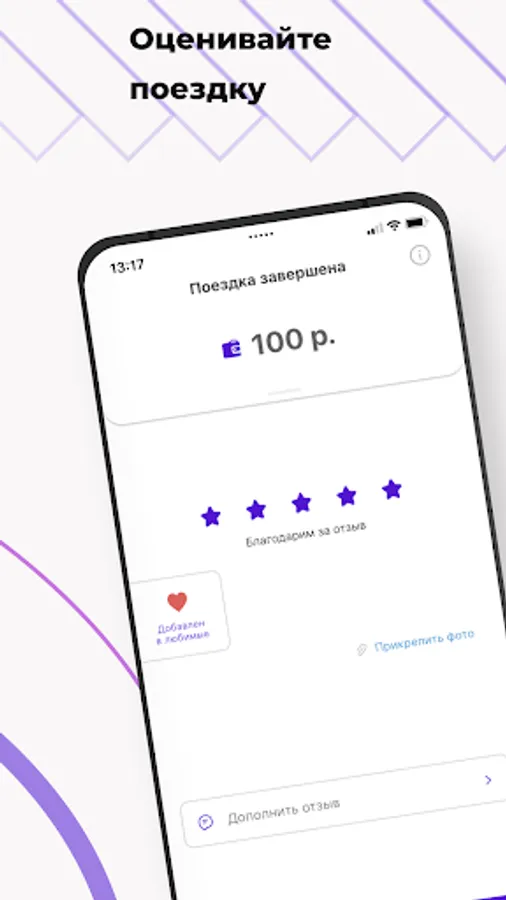 Evaluate the trip using ready-made templates, add the driver to your favorites. Attach a photo to the review, or see payment details after the trip.