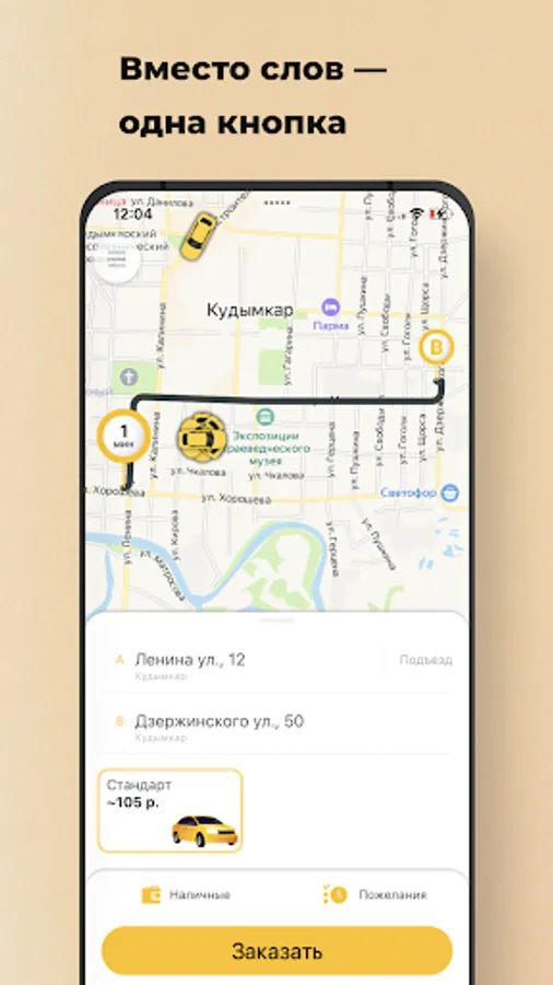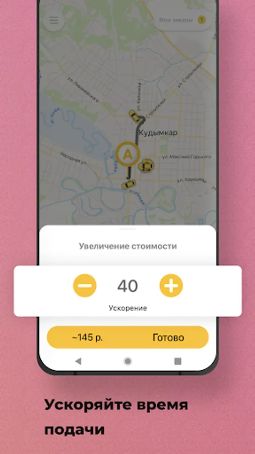 Order Our taxi in the city of Kudymkar through the application. It's 3 times faster than over the phone! There is a couple of seconds between the desire to get to the right place and the search for a car.