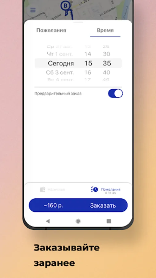 Select the "Pre-order" option. The car search will start shortly before the trip order, and the car will arrive at the appointed time. Also, you will know in advance the cost of the trip.