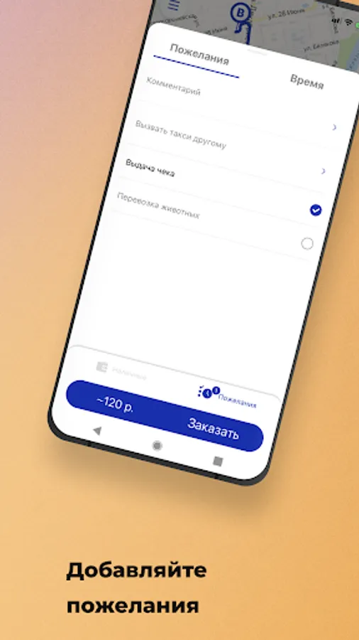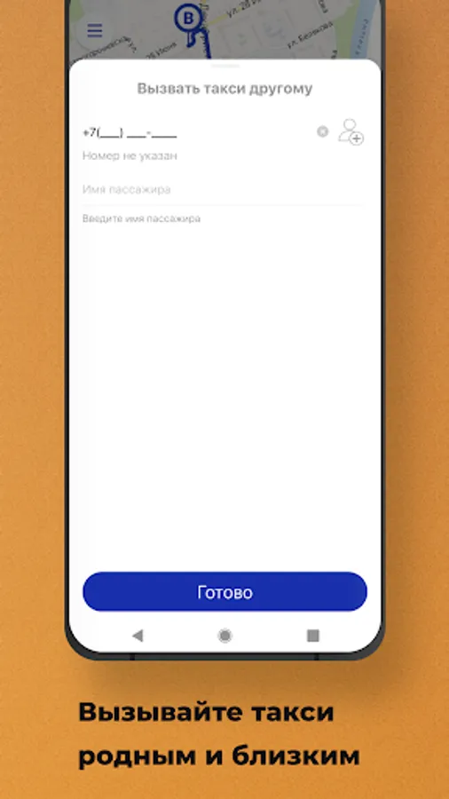 Use the option “Call a taxi for someone else” in the “Wishes” section and indicate his phone number. When the taxi arrives, an SMS will be sent to the specified number, and you will receive a message in the application.