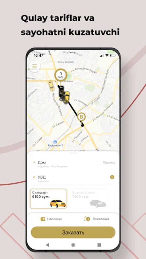 Tez va qulay taksi buyurtma qilish - qo'ng'iroqlarsiz va kutishsiz. Biznes Taxi ilovasiga o'ting va Andijon, Asaka, Qo'rg'ontepa, Marhamat, Shahrixon, Baliqchi, Chinobod, Pahtaobod, Jalaquduq, Bo'ston, Pahtaobod, Do'stlik, Izboskan shaharlarida taksiga buyurtma bering. ...