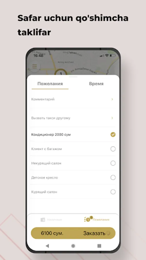 Sayohatingizni yanada qulay qilish uchun City Taxi ilovasidagi ro'yxatdan maxsus variantlarni qo'shing. Buyurtma yaratilgandan so'ng, ularni tahrir qilish mumkin.