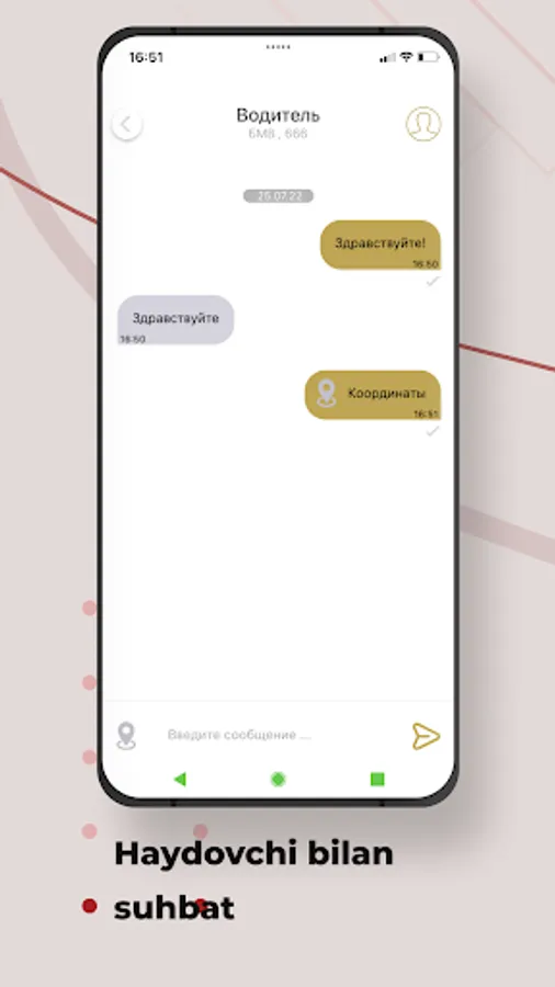 Siz haydovchiga ilovaning ichki suhbatida yozishingiz va savollaringizni aniqlashtirishingiz yoki allaqachon ketayotganingiz haqida xabar berishingiz mumkin.