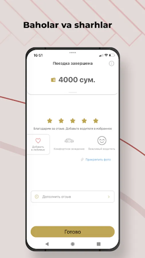 Haydovchiga 5 yulduz bering, reyting uchun bir yoki bir nechta tayyor shablonni tanlang yoki ilova haqida o'z fikringizni qoldiring